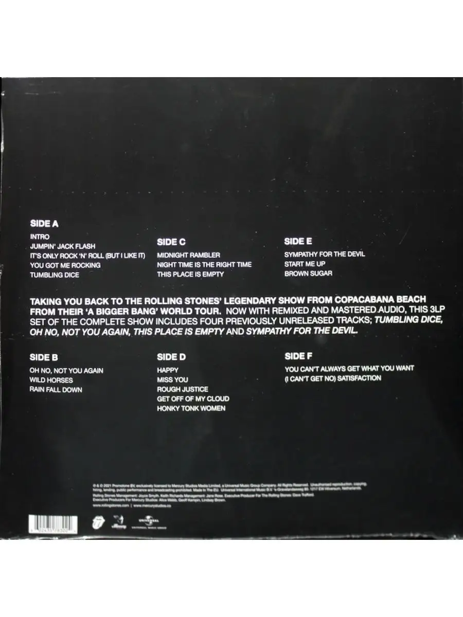 "A Bigger Bang - Live On Copacabana Beach" - запись концертного выступления группы The Rolling Stones. Концерт был записан в 2006 году в Рио-де-Жанейро на пляже Копакабана. Это был один из самых больших бесплатных концертов в истории, на который пришли полтора миллиона зрителей. Издание также включает четыре ранее неизданных трека: "Tumbling Dice", "Oh No, Not You Again", "This Place is Empty" и "Sympathy For The Devil".Релиз представлен на тройном черном 180-граммовом виниле.Трек-лист:A1. Jumpin’ Jack FlashA2. It's Only Rock 'n' Roll (But I Like It)A3. You Got Me RockingA4. Tumbling DiceB1. Oh No, Not You AgainB2. Wild HorsesB3. Rain Fall DownC1. Midnight RamblerC2. Night Time Is The Right TimeC3. This Place Is EmptyD1. HappyD2. Miss YouD3. Rough JusticeD4. Get Off of My CloudD5. Honky Tonk WomenE1. Sympathy For The DevilE2. Start Me UpE3. Brown SugarF1. You Can't Always Get What You WantF2. (I Can't Get No) Satisfaction