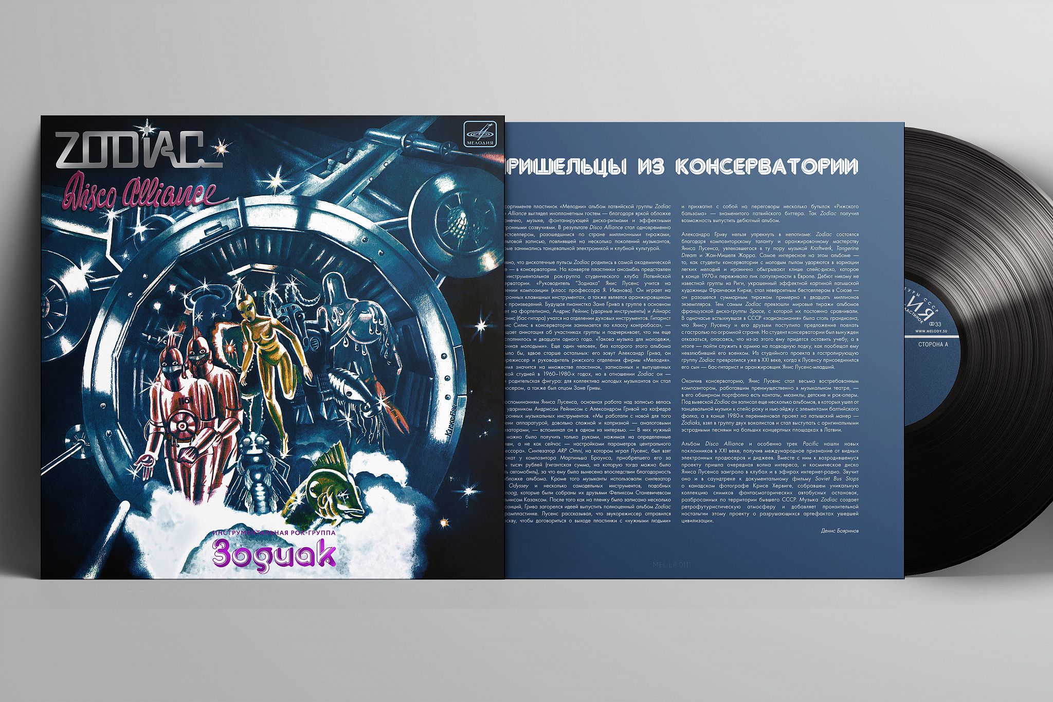 Латвийская группа Zodiac возникла в в конце 1970-х в Латвийской консерватории, считалась локальной инструментальной рок-группой и далеко ушла от академических правил. «Культовая запись», «бестселлер», инопланетная музыка — лишь немногие эпитеты их первого альбома «Disco Alliance».
